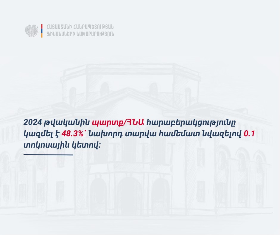2024 թվականին պարտք/ՀՆԱ հարաբերակցությունը կազմել է 48.3%` նախորդ տարվա համեմատ նվազելով 0.1 տոկոսային կետով: