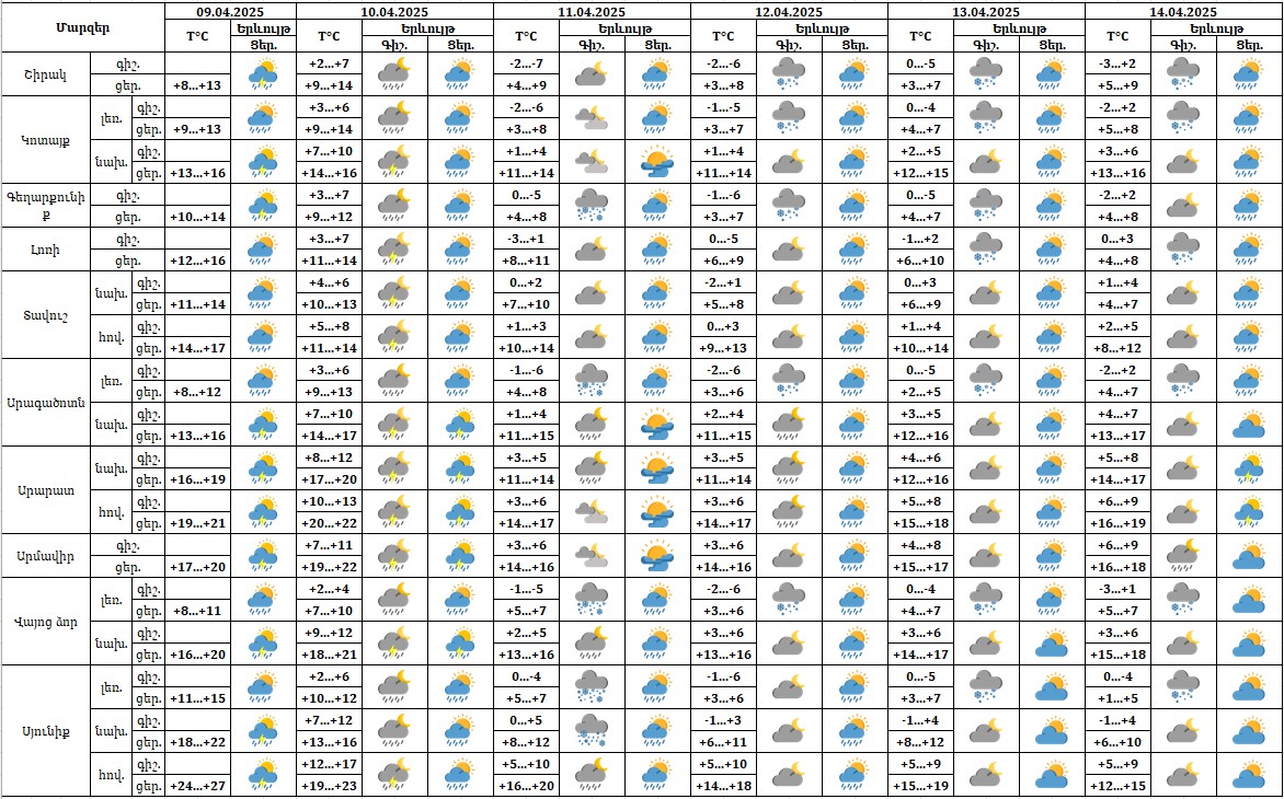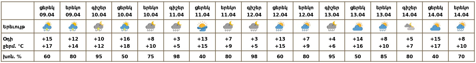 Երևանում՝ ապրիլի 9-ի ցերեկը, 10-14-ը սպասվում է կարճատև անձրև, հնարավոր է նաև ամպրոպ։ Ապրիլի 9-10-ը սպասվում է քամու ուժգնացում՝ 13-15 մ/վ արագությամբ։