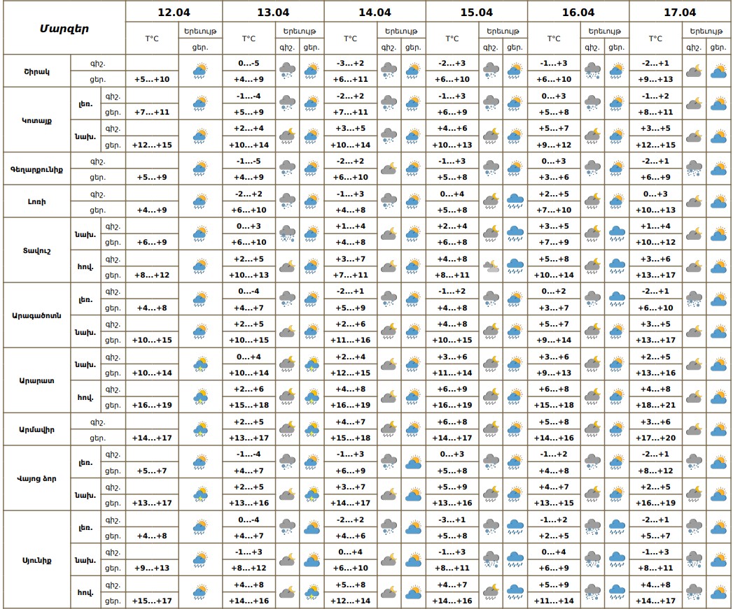 Հանրապետության տարածքում ապրիլի 12-ի ցերեկը, 13-14-ին, 17-ի գիշերը` առանձին շրջաններում, 15-16-ին շրջանների մեծ մասում օրվա ընթացքում սպասվում է անձրև, առանձին հատվածներում նաև ամպրոպ: