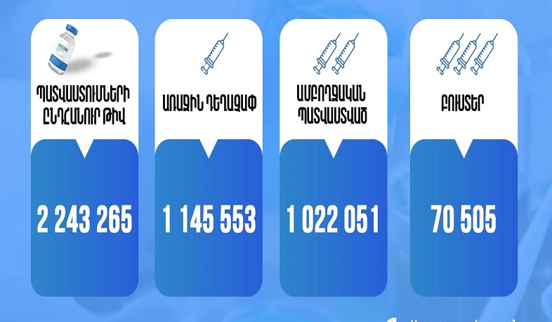 Ermənistanda ümumilikdə 2 243 265 doza peyvənd vurulub. Bu barədə ER Səhiyyə Nazirliyi məlumat yayıb.
