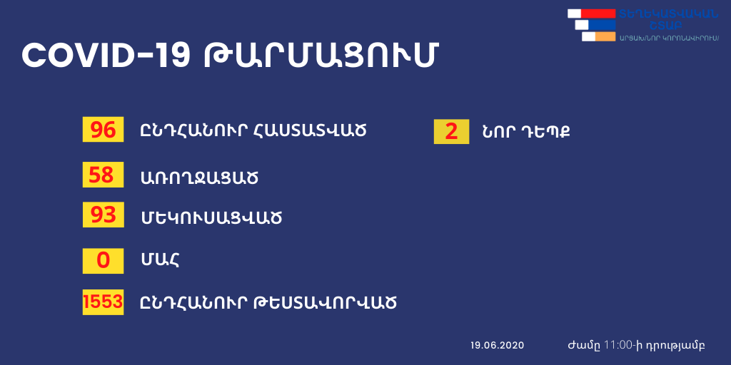 Another 2 citizens diagnosed with COVID-19 overcame the disease. So far, 98 cases of infection have been confirmed in Artsakh, 58 citizens have recovered, 93 have been isolated.