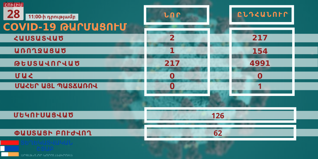 According to the Artsakh Ministry of Health, 2 new cases of coronavirus disease have been confirmed in the country, they are connected with the known hotbed in Martakert. 1 citizen with coronavirus recovered.