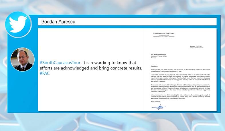 Romanian Foreign Minister Bogdan Aurescu tweeted about his visit to the South Caucasus in June with the foreign ministers of the two other EU countries.
