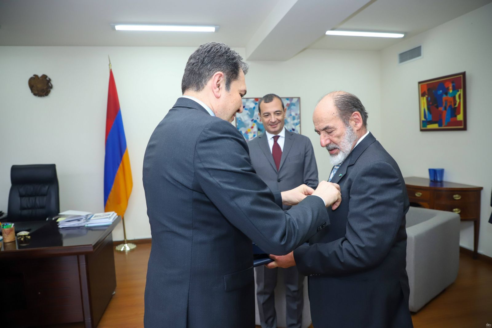 On December 2, Paruyr Hovhannisyan, Deputy Foreign Minister of Armenia received Antonino Montalto, Honorary Consul of the Italian Republic in Gyumri on the occasion of the completion of his mission․ The Deputy Minister handed over the “Order of Friendship” to the Honorary Consul awarded by the President of the Republic of Armenia for his significant contribution to the strengthening and development of Armenian-Italian friendly ties.