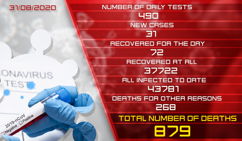 Update. 31.08.2020. 31 new cases of infection with coronavirus have been confirmed, 72 have recovered