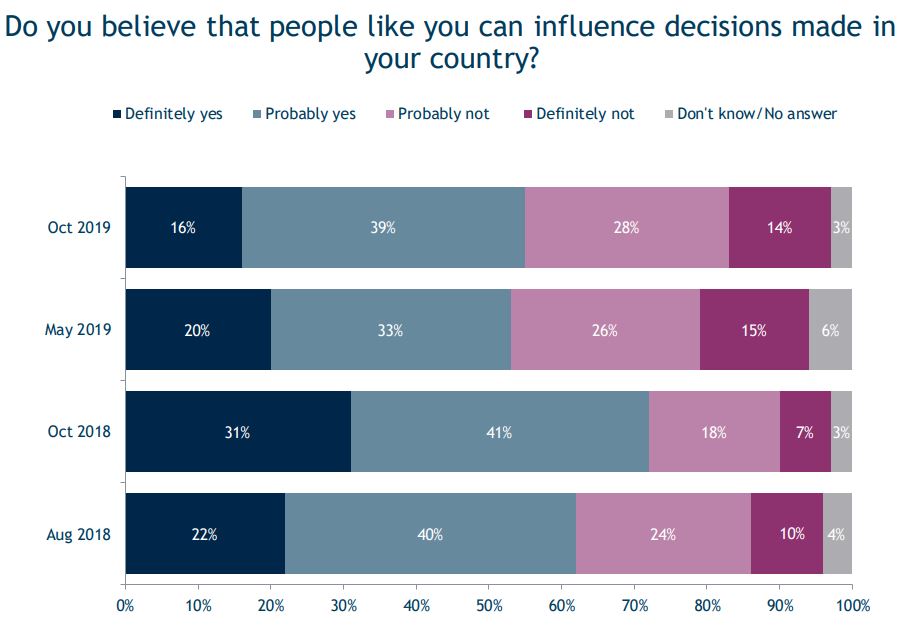 Հարցվածների 16%-ը (2018-ին՝ 31%-ը) վստահ է, իսկ 39%-ը (2018-ին՝ 41%-ը) հավատում է, որ իր պես մարդիկ կարող են ազդել երկրում ընդունվող որոշումների վրա, 28%-ը կարծում է, որ հավանաբար՝ ոչ, իսկ 14 տոկոսը համոզված է, որ չի կարող որևէ ազդեցություն ունենալ երկրում ընդունվող որոշումների վրա: Նախորդ տարվա հարցման համեմատ ցուցանիշները փոքր-ինչ վատացել են: