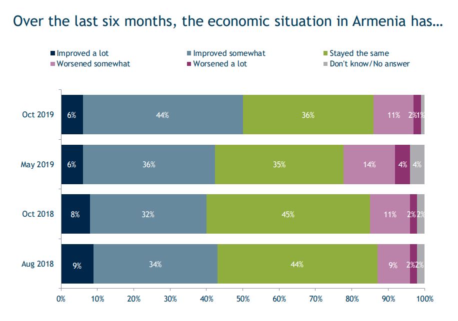 Հարցվածների 6%-ը վստահ է, որ վերջին վեց ամիսների ընթացքում Հայաստանի տնտեսական վիճակը էականորեն բարելավվել է, 40%-ը կարծում է, որ տնտեսական վիճակը բարելավվել է ինչ-որ կերպ: Հարցվածների 36%-ի համար այն մնացել է նույնը: 11%-ի կարծիքով՝ փոքր-ինչ, իսկ 2%-ի համար տնտեսական վիճակը շատ է վատացել: Նախորդ տարվա նույն ժամանակահատվածում իրականացված հարցման համեմատ ցուցանիշները դրական են: