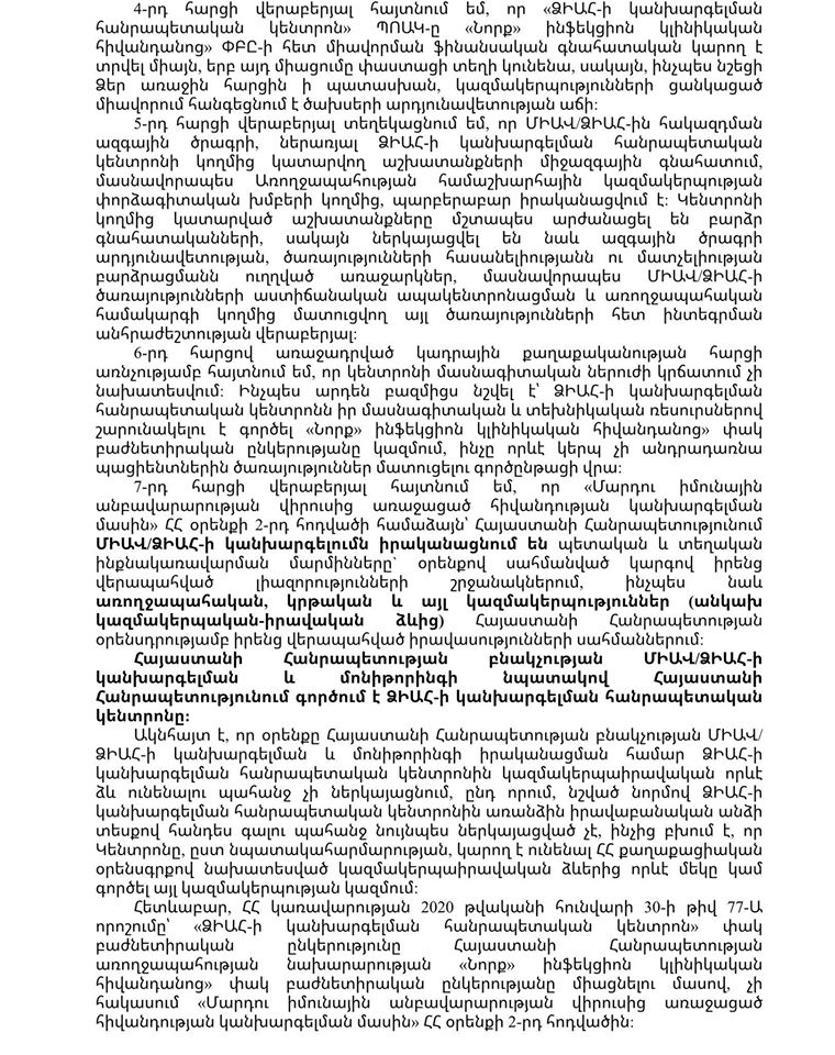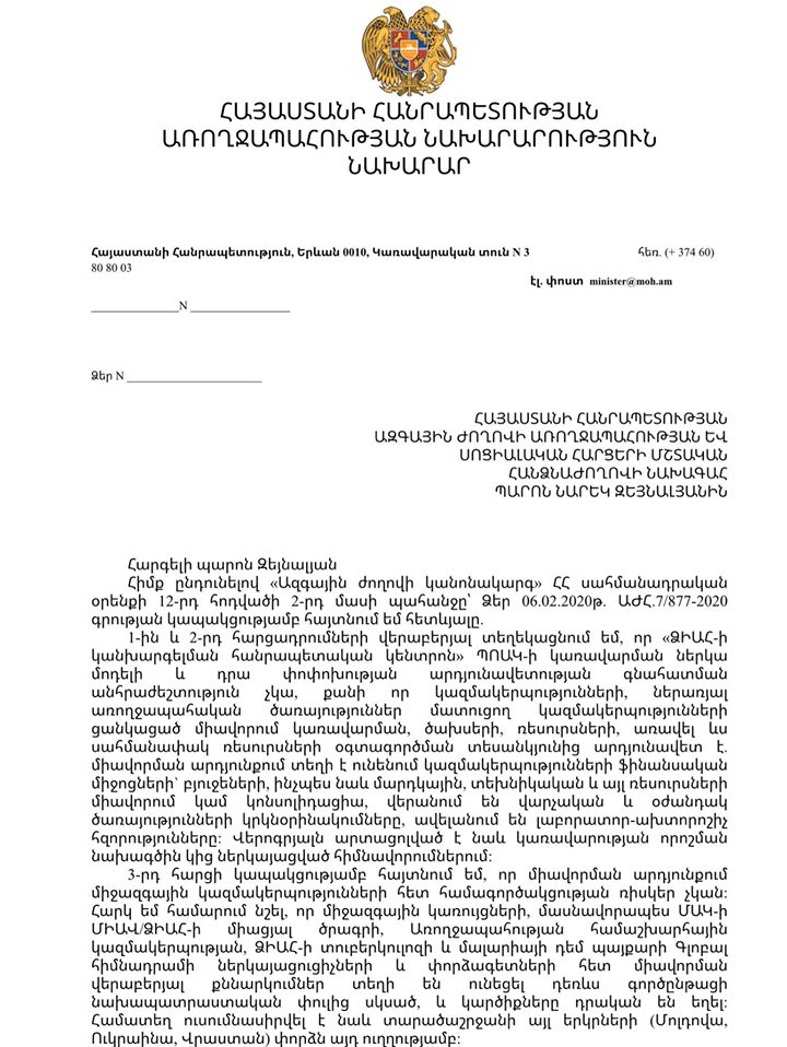 Այսօր հասկանալի պատճառներով չկարողացա մասնակցել ԱԺ առողջապահության և սոցիալական հարցերի հանձնաժողովի կազմակերպած քննարկմանը` նվիրված մեր ենթակայությամբ գործող երկու պետական ծառայությունների ինտեգրմանը, սակայն հարկ եմ համարում հանրության հետ կիսվել հանձնաժողովի նախագահի հարցմանը ի պատասխան գրված նամակը, քանի որ մամուլում նկատեցի, որ այն մեկնաբանվում է, որպես «անհիմն» կամ «առանց վերլուծությունների»: Այդ մասին Ֆեյսբուքի էջում գրել է առողջապահության նախարար Արսեն Թորոսյանը՝ կից հրապարակելով պատասխան նամակը: