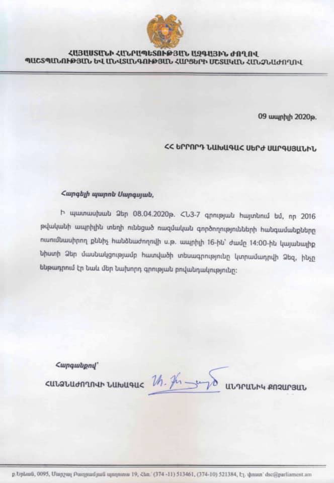 «ՀՀ երրորդ նախագահի գրասենյակը քիչ առաջ ստացավ 2016 թ. ապրիլին ծավալված ռազմական գործողությունների հանգամանքներն ուսումնասիրելու նպատակով ստեղծված հատուկ քննիչ հանձնաժողովի պատասխանը գրասենյակի` ս.թ. ապրիլի 8-ի գրությանը, որտեղ ակնկալվում էր հստակ արտահայտել հանձնաժողովի դիրքորոշումը ՀՀ երրորդ նախագահի հարցադրման կապակցությամբ` նկատի առնելով, որ հանձնաժողովի նախորդ գրության մեջ «տեսաձայնագրության տրամադրումը կարող է բավարարվել միայն պետական և ծառայողական գաղտնիքի մասին օրենքի պահանջներին համապատասխան և սահմանված ընթացակարգերի պահպանման արդյունքում» ձևակերպումը բացարձակապես պարզորոշ չէր պատասխանում հարցադրմանը, ինչը արվել է վերջին պատասխանում: