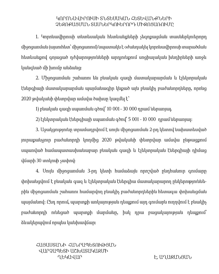Կառավարությունն այսօր ընդունել է կորոնավիրուսի տնտեսական հետևանքների չեզոքացման 12-րդ միջոցառումը: