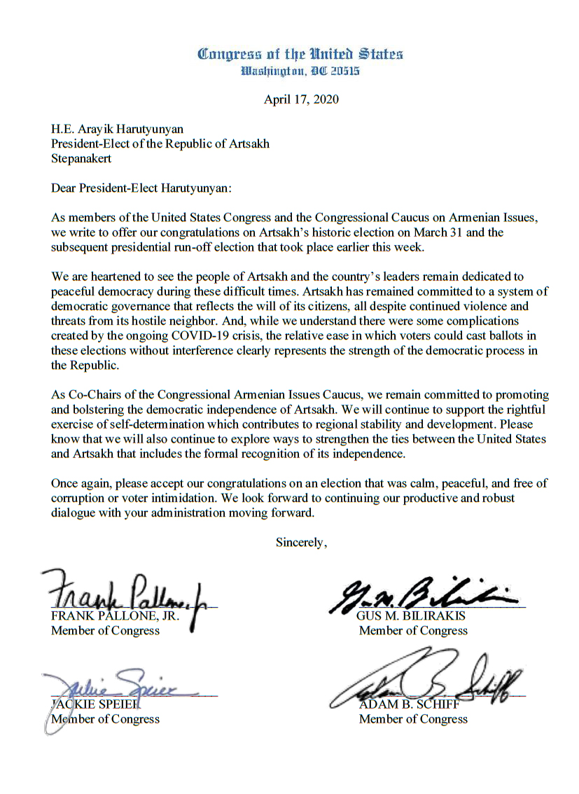 Որպես ԱՄՆ Կոնգրեսի և Կոնգրեսի Հայկական հարցերով հանձնախմբի անդամներ՝ մենք շնորհավորում ենք մարտի 31-ին Արցախում տեղի ունեցած պատմական ընտրությունների և դրան հաջորդած նախագահական ընտրության երկրորդ փուլի կապակցությամբ: