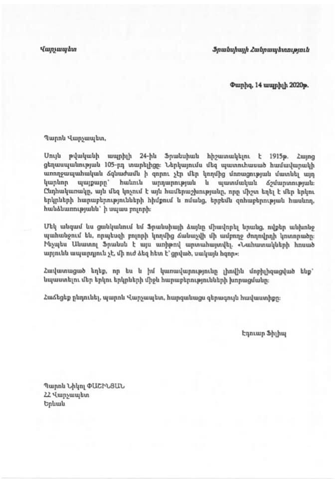 «Սույն թվականի ապրիլի 24-ին Ֆրանսիան հիշատակելու է Հայոց ցեղասպանության 105-րդ տարելիցը: Ներկայումս մեզ պատուհասած համավարակի առողջապահական ճգնաժամն ի զորու չէր մոռացության մատնել այդ կարևոր պայքարը հանուն արդարության և պատմական ճշմարտության: