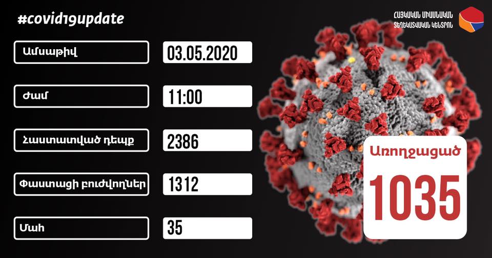 Մայիսի 3-ի, ժամը 11:00-ի դրությամբ հաստատվել է կորոնավիրուսային հիվանդության ընդհանուր 2386 դեպք, որոնցից 1035-ն` առողջացած, 35-ը` մահվան ելքով: Կորոնավիրուսային հիվանդությամբ այս պահին փաստացի բուժում է ստանում 1312 պացիենտ: Ընդհանուր առմամբ, կատարվել է 24177 թեստավորում: