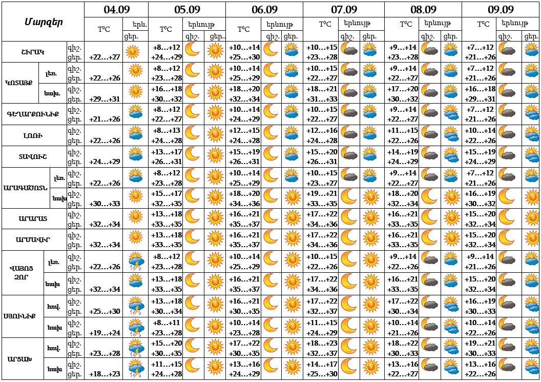 Հանրապետության տարածքում սեպտեմբերի 4-ի ցերեկը առանձին շրջաններում սպասվում է կարճատև անձրև և ամպրոպ: Սեպտեմբերի 5-9-ը սպասվում է առանց տեղումների եղանակ: