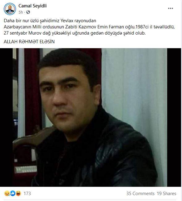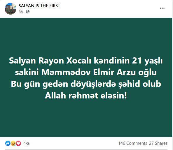 «Էլմիր Մամեդով Արզու օղլուն՝ Սալյանի շրջանից, 21 տարեկան, զոհվել է այսօրվա մարտում»: