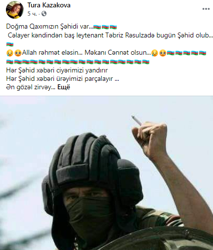 «Լեյտենանտ Թեբրիզ Ռասուլզադեն զոհվել է այսօր: Յուրաքանչյուր զոհ խորացնում է մեր ցավը»: