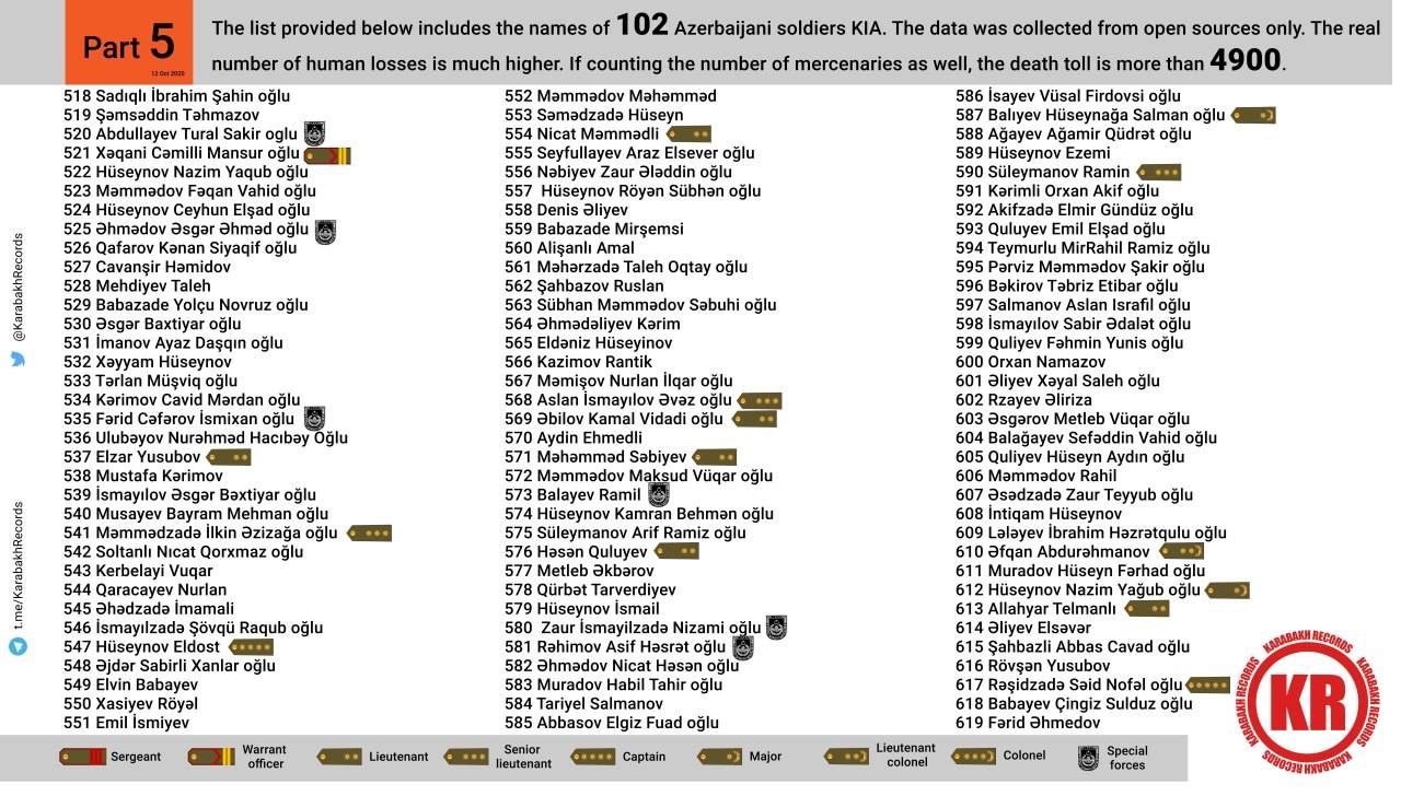 «Օրբելի» վերլուծական կենտրոնի փորձագետ, ադրբեջանագետ Տարոն Հովհաննիսյանը Ֆեյսբուքի իր էջում հրապարակել է Ադրբեջանի ԶՈՒ չհայտարարված, բայց բաց աղբյուրների հետազոտության արդյունքում հայտնաբերված կորուստների անվանացուցակի 5-րդ մասը։