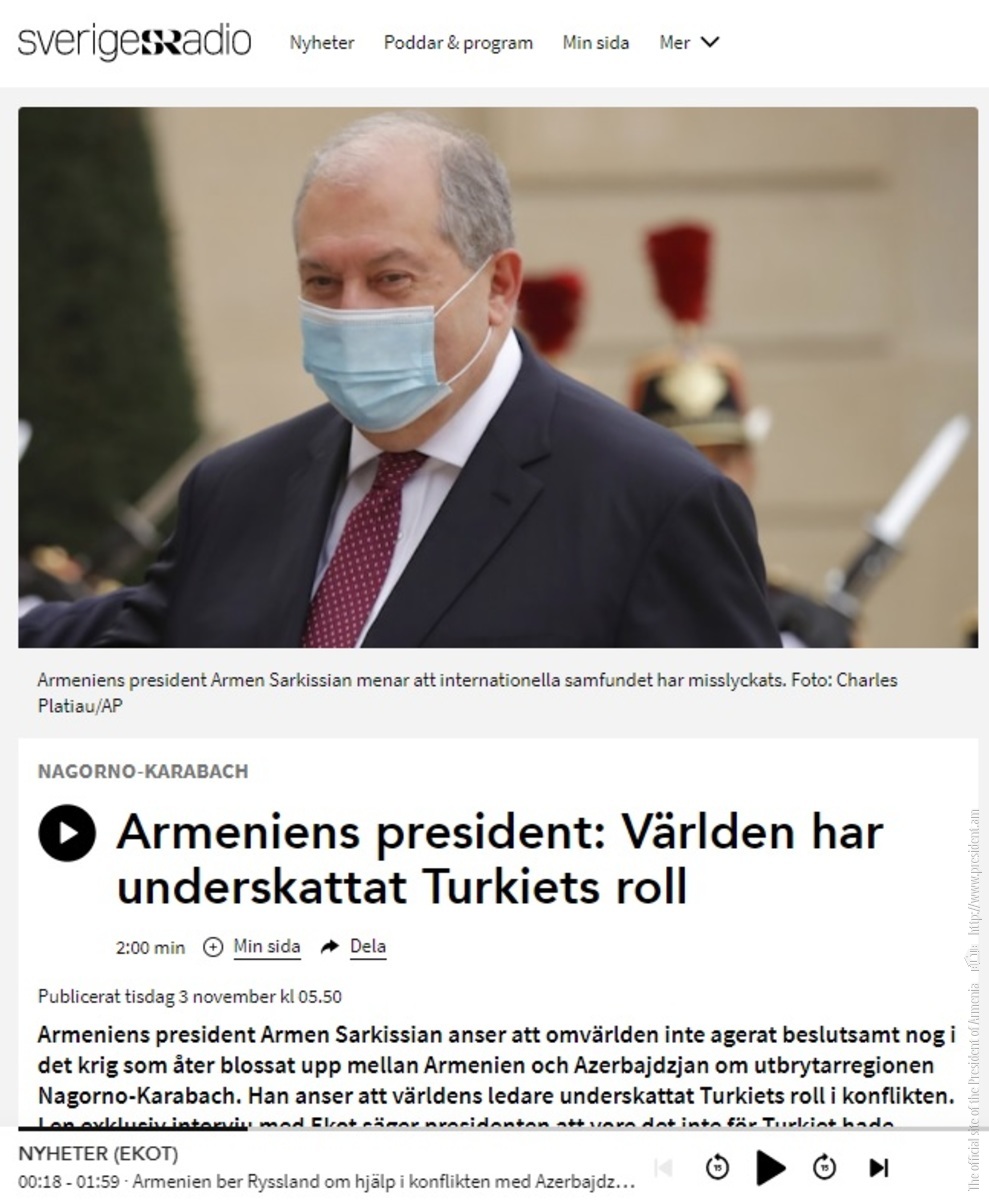 Շվեդիայի հանրային Sveriges Radio AB-ն հաղորդում է հեռարձակել Արցախի դեմ Ադրբեջանի սանձազերծած ռազմական ագրեսիայի և դրանում Թուրքիայի ներգրավվածության վերաբերյալ՝ հեռարձակելով հատվածներ Հայաստանի Հանրապետության նախագահ Արմեն Սարգսյանի հետ հարցազրույցից: