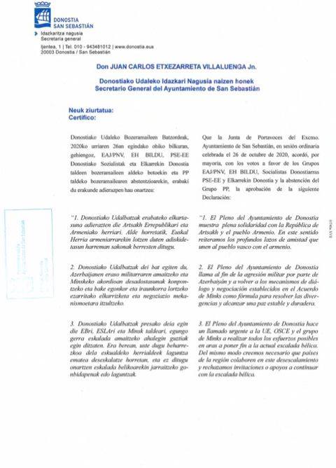 Բասկերի երկրի Սան Սեբաստիան քաղաքի քաղաքային խորհուրդն ընդունել է հայտարարություն, որով իր համերաշխությունն է հայտնում Արցախի Հանրապետությանն ու հայ ժողովրդին, կոչ է անում Ադրբեջանին դադարեցնել ռազմական ագրեսիան, հայտնել է Իսպանիայում Հայաստանի դեսպանությունը: