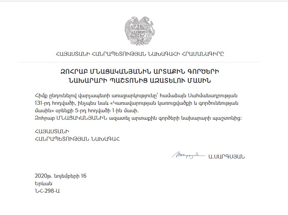 «Հիմք ընդունելով վարչապետի առաջարկությունը՝ համաձայն Սահմանադրության 131-րդ հոդվածի, ինչպես նաև «Կառավարության կառուցվածքի և գործունեության մասին» օրենքի 5-րդ հոդվածի 1-ին մասի՝ Զոհրաբ Մնացականյանին ազատել արտաքին գործերի նախարարի պաշտոնից»,- ասված է հրամանագրում: