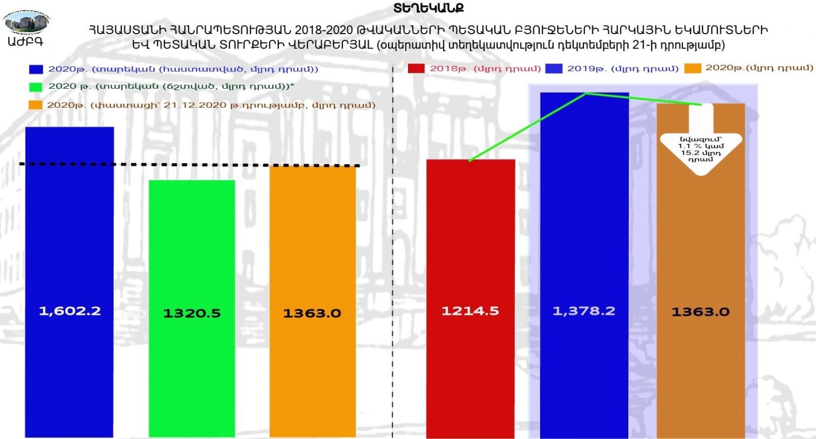 2020 թ. դեկտեմբերի 21-ի դրությամբ հարկային եկամուտները և պետական տուրքերը կազմել են 1363 մլրդ դրամ, որն արդեն իսկ նշանակում է, որ տարեկան ճշտված ցուցանիշը դեկտեմբերի 21-ի դրությամբ գերակատարվել է ավելի քան 40 մլրդ-ով»: