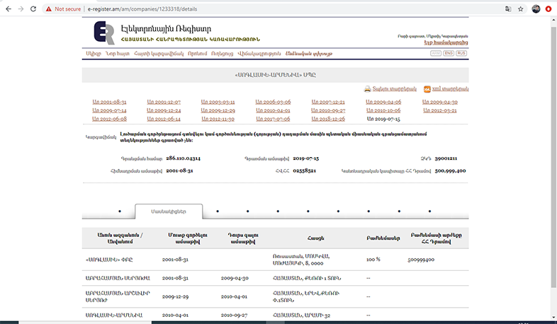 Ըստ իրավաբանական անձանց էլեկտրոնային ռեգիստրի տվյալների՝ «Սոգլասիե-Արմենիա»-ի միակ մասնակիցը «Սոգլասիե» ՓԲԸ-ն է, որը գրանցված է Մոսկվայում ու պատկանում է Արա Աբրահամյանին։ «Սոգլասիե»-ն ներդրումային խոշոր ընկերություն է։ «Սոգլասիե-Արմենիա»-ում  բաժնեմաս է ունեցել նաև Աբրահամյանի եղբայրը՝ Սերյոժա Աբրահամյանը, որը 2003-2007 թթ. եղել է անկուսակցական պատգամավոր, իսկ 2007-ին պատգամավոր դարձավ ՕԵԿ-ից: Արա Աբրահամյանի մյուս եղբայրները՝ Գագիկ և Արմեն Աբրահամյանները ևս, եղել են պատգամավորներ: «Սոգլասիե-Արմենիա»-ն հիմնվել է 2001-ին, զբաղվում է կապիտալ շինարարությամբ ու վերանորոգմամբ, անշարժ գույքի գործառնություններով, մեծածախ առևտրով։ Կանոնադրական կապիտալը մոտ 501 միլիոն դրամ է։