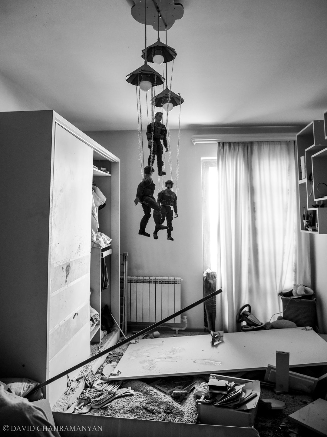 Իսկ առաջին նկարը Ստեփանակերտում է արել՝ սև ու սպիտակ։ «Սա առաջին լուսանկարն է՝ մանկասենյակ, առաստաղից խաղալիք զինվորներ են կախված․․․ խորհրդանշական էր։ Անգույն է, որովհետև պատերազմը գույն չունի»։