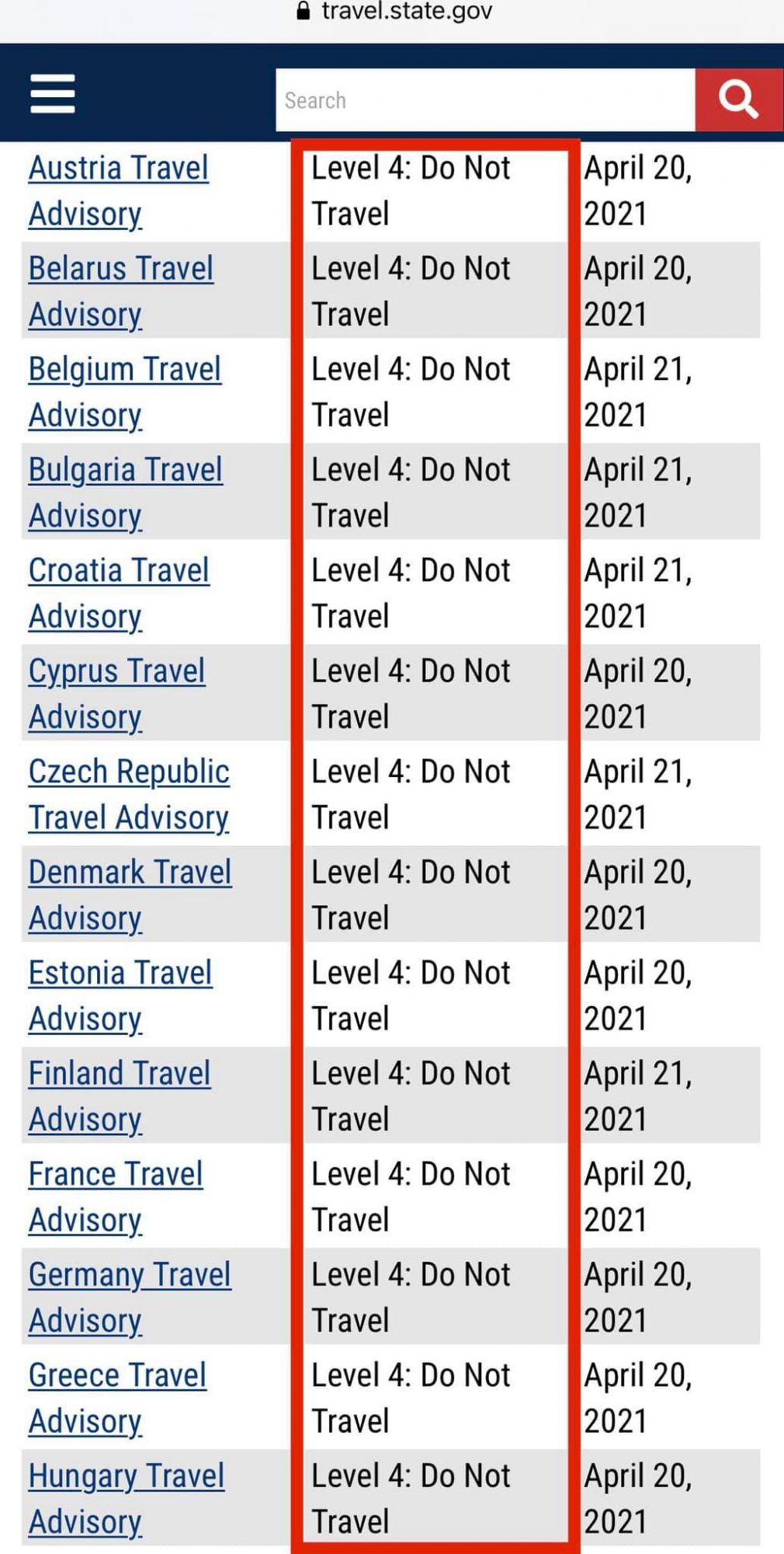 «ԱՄՆ պետդեպը, բացի Հայաստանից, ևս 149 երկրի համար (219-ից) ճամփորդելու նախազգուշացումը բարձրացրել է ամենաբարձր՝ 4-րդ մակարդակի՝ նշելով նույն պատճառը՝ «Չճամփորդել, որովհետև քովիդ է»: Այդ երկրների ցանկում են Գերմանիան, Ֆրանսիան, Դանիան, Հունաստանը և այլն: Իսկ սահմանի հետ կապված նախազգուշացումները նույնն են պատերազմից ի վեր և նախազգուշացման 4-րդ՝ կարմիր մակարդակի հետ որևէ կապ չունեն: