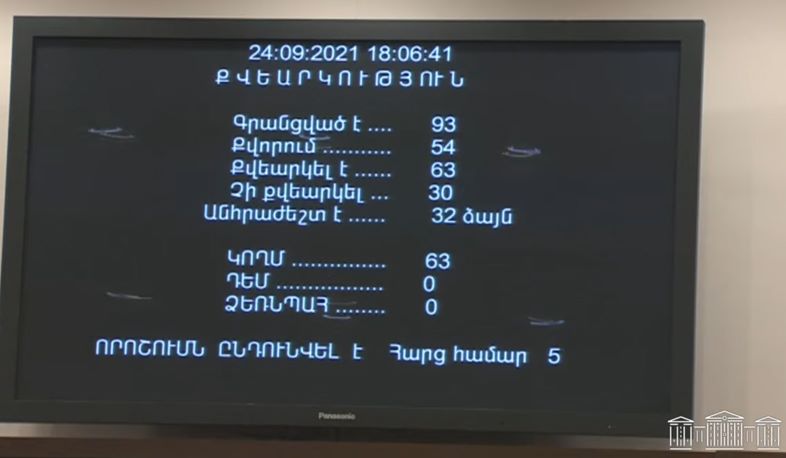 ԱԺ նախագահ Ալեն Սիմոնյանը տեղեկացրեց, որ կողմ է քվեարկել 63 պատգամավոր: