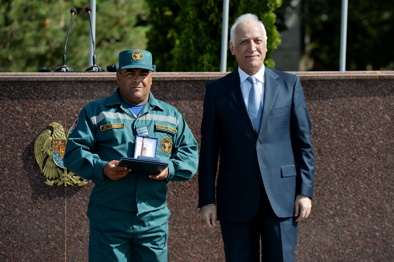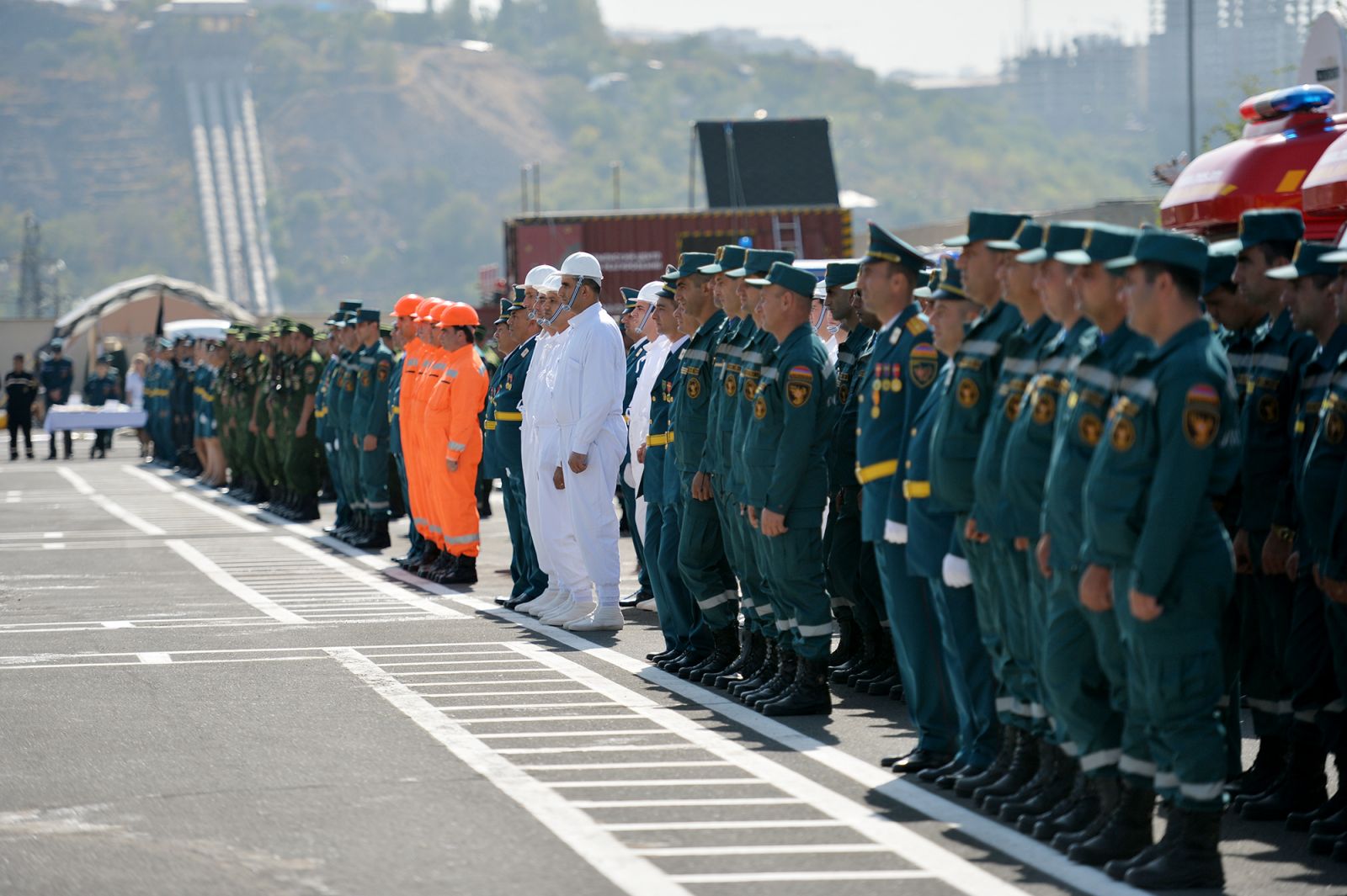 Պարգևատրման արարողությունից հետո Հանրապետության նախագահը հետևել է ՀՀ ԱԻՆ ՓԾ կառուցվածքային ստորաբաժանումների հանդիսավոր քայլերթին և ԱԻՆ հատուկ փրկարարական ջոկատի ներկայացրած ցուցադրական վարժանքներին: Նախագահն ու վարչապետն արտակարգ իրավիճակների նախարար Արմեն Փամբուխչյանի ուղեկցությամբ ծանոթացել են նաև շարահրապարակում ներկայացված նախարարության տարբեր ստորաբաժանումների գործունեությանն ու հնարավորություններին: