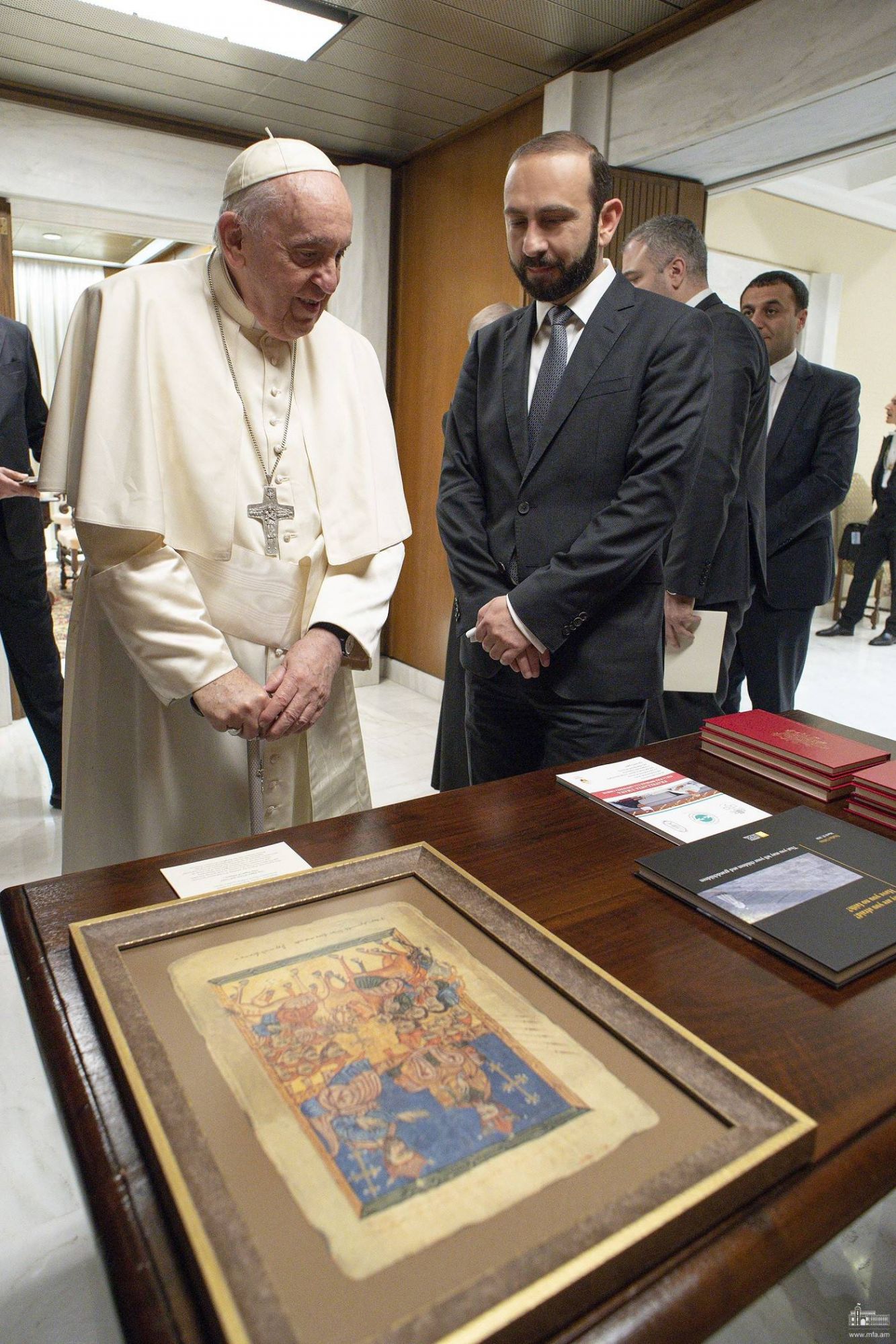 Շնորհակալություն հայտնելով հանդիպման հնարավորության համար՝ ԱԳ նախարար Արարատ Միրզոյանը Սրբազան Քահանայապետին է փոխանցել հայ ժողովրդի ու կառավարության ջերմ ողջույնները։