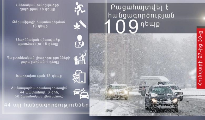 Ըստ ոստիկանության օպերատիվ հաղորդագրությունների ամփոփագրերի՝ հունվարի 27-30-ը Հայաստանի Հանրապետության ոստիկանության ստորաբաժանումները բացահայտել են հանցագործության 109 դեպք, որոնցից 6-ը՝ նախկինում կատարված։