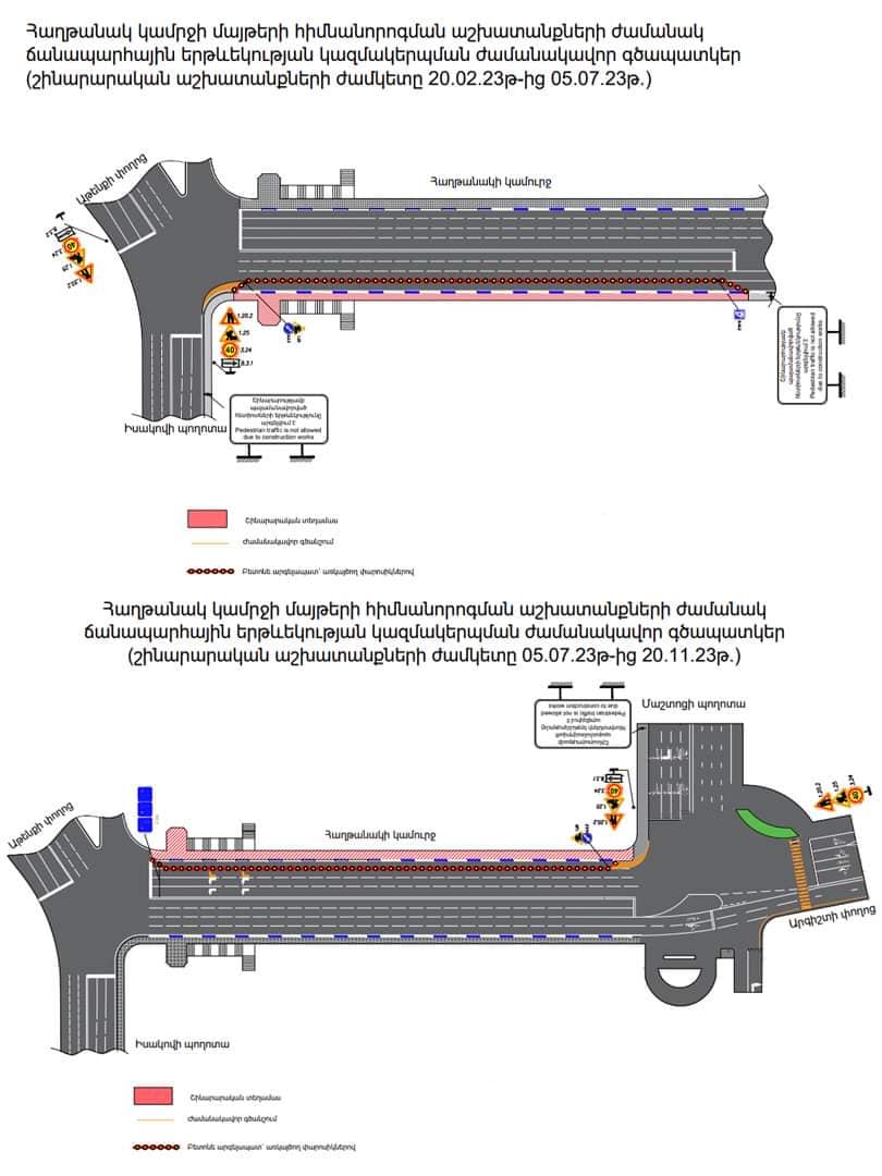 Ըստ այդմ՝ փետրվարի 20-ից մինչև հուլիսի 5-ը կփակվի Իսակովի պողոտայից դեպի Արգիշտիի փողոց ուղղության աջակողմյան հատվածը, իսկ հուլիսի 5-ից մինչև նոյեմբերի 20-ը՝ Իսակովի պողոտայից դեպի Արգիշտիի փողոց ուղղության ձախակողմյան հատվածը: