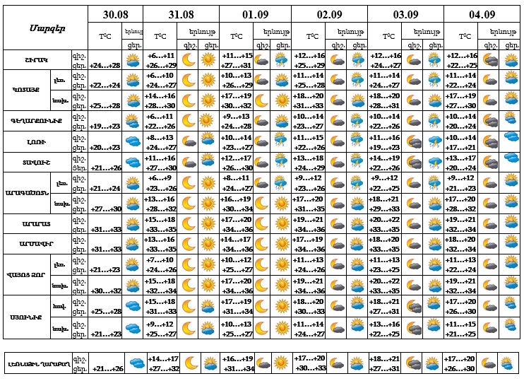 Օգոստոսի 31-ին, սեպտեմբերի 1-ի և 2-ի գիշերը հանրապետությունում սպասվում է առանց տեղումների եղանակ։ Սեպտեմբերի 1-3-ին կեսօրից հետո առանձին շրջաններում սպասվում է կարճատև անձրև և ամպրոպ, 2-4-ին առանձին հատվածներում հնարավոր է մառախուղ։