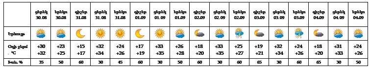 Երևանում օգոստոսի 31-ին, սեպտեմբերի 1-ին, 4-ին սպասվում է առանց տեղումների եղանակ։ Սեպտեմբերի 2-3-ին երեկոյան ժամերին քաղաքի առանձին հատվածներում հնարավոր են կարճատև անձրև և ամպրոպ, ամպրոպի ժամանակ սպասվում է քամու ուժգնացում՝ 15-18 մ/վրկ արագությամբ։