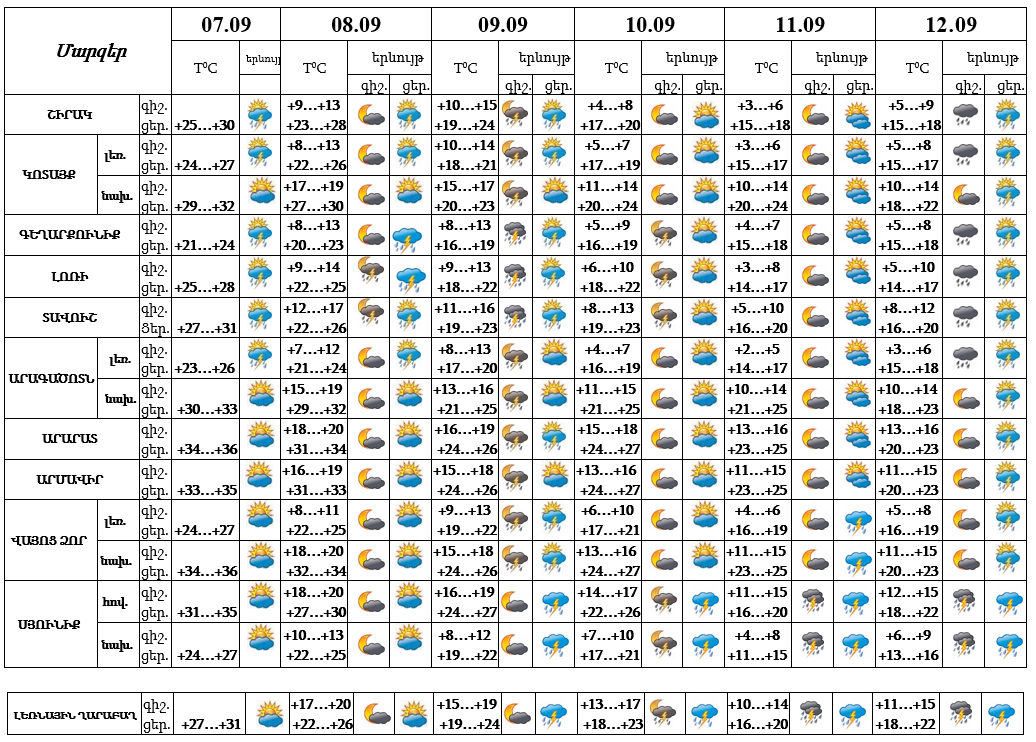 Հանրապետության տարածքում սեպտեմբերի 7-ի ցերեկը, 8-12-ին առանձին շրջաններում սպասվում են կարճատև անձրև և ամպրոպ, 8-ի ցերեկը, 9-ին՝ առանձին հատվածներում՝ ինտենսիվ, առանձին վայրերում հնարավոր է նաև մառախուղ։