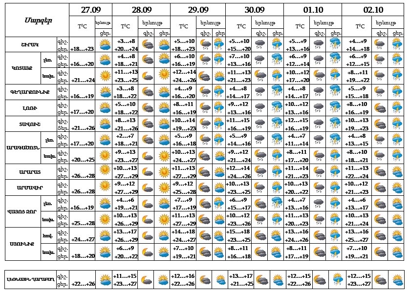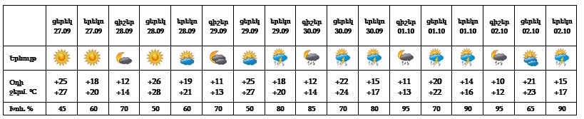 Հանրապետության տարածքում սեպտեմբերի 28-ին սպասվում է առանց տեղումների եղանակ։ Սեպտեմբերի 29-30-ին, հոկտեմբերի 2-ին առանձին շրջաններում, հոկտեմբերի 1-ին շրջանների զգալի մասում սպասվում են անձրև և ամպրոպ։ Սեպտեմբերի 29-30-ին, հոկտեմբերի 1-2-ին առանձին վայրերում սպասվում է նաև մառախուղ։ Քամին՝ հարավարևմտյան 2-4 մ/վրկ, ամպրոպի ժամանակ սպասվում է քամու ուժգնացում 17-20 մ/վրկ արագությամբ։ Օդի ջերմաստիճանը սեպտեմբերի 28-ին աստիճանաբար կբարձրանա 3-5 աստիճանով, 30-ի և հոկտեմբերի 1-ի ցերեկային ժամերին նույնքան կնվազի։