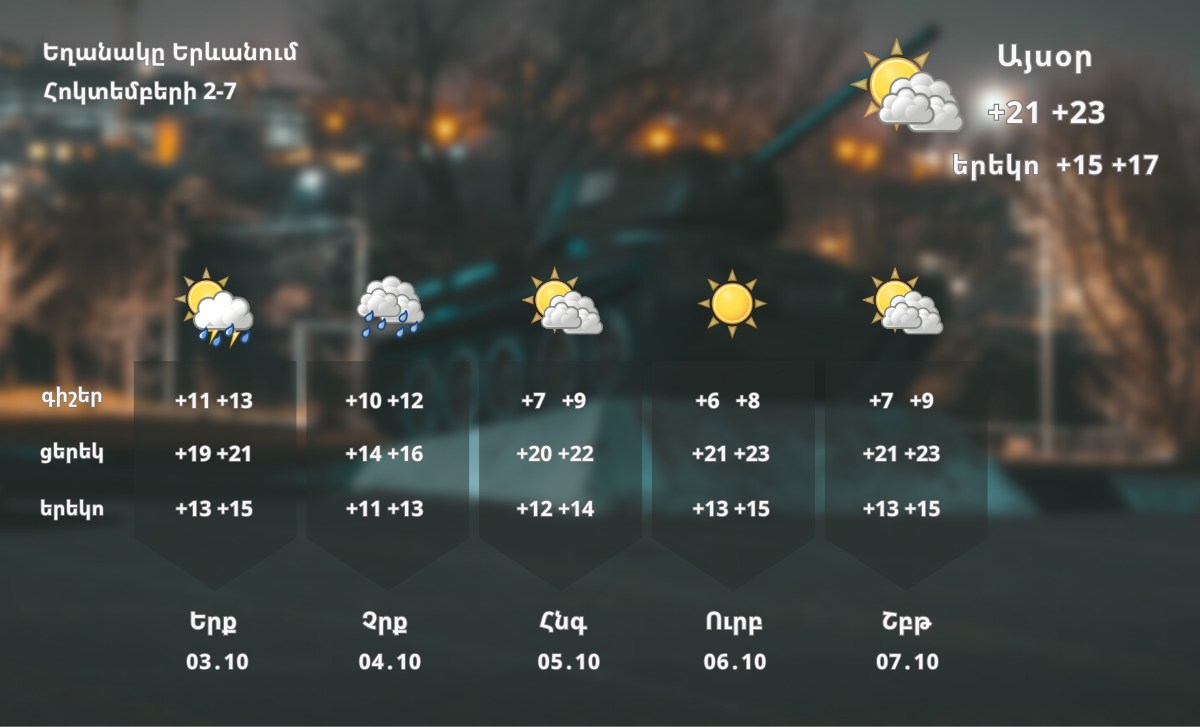 Երևանում հոկտեմբերի 3-ին, 4-ին ժամանակ առ ժամանակ սպասվում են անձրև և ամպրոպ, ամպրոպի ժամանակ քամու ուժգնացում՝ 14-17մ/վ արագությամբ։