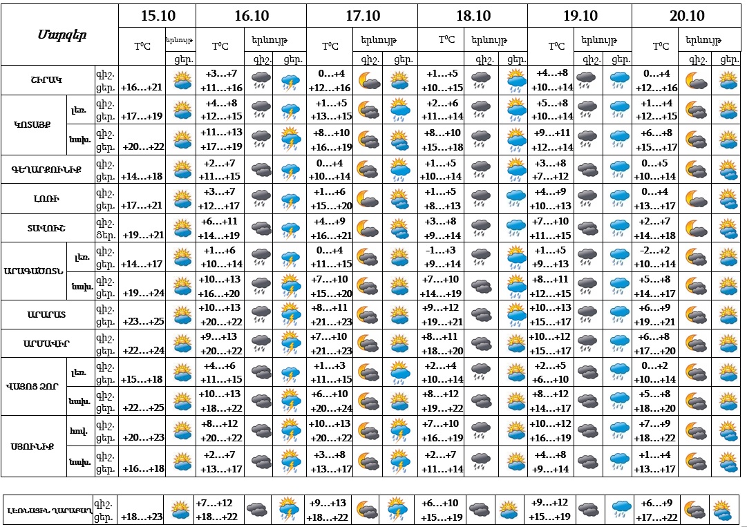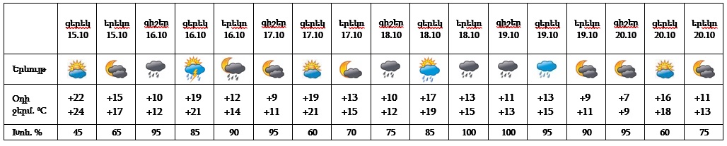 Հոկտեմբերի 15-ի ցերեկը, 20-ին սպասվում է առանց տեղումների եղանակ։ Հոկտեմբերի 16-ին, 19-ին շրջանների զգալի մասում, 17-ի ցերեկը, 18-ին առանձին շրջաններում սպասվում է անձրև, առանձին շրջաններում՝ նաև ամպրոպ։ Քամին՝ հարավարևմտյան 2-5 մ/վրկ, ամպրոպի ժամանակ հնարավոր է ուժգնացում 16-19մ/վրկ արագությամբ: Օդի ջերմաստիճանը հոկտեմբերի 16-ի ցերեկը կնվազի 3-5 աստիճանով։