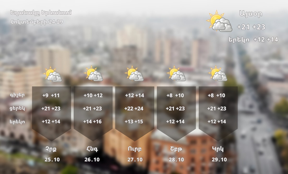 Երևանում հոկտեմբերի 25-29-ը սպասվում է առանց տեղումների եղանակ։ Հոկտեմբերի 26-ին, 27-ին սպասվում է քամու ուժգնացում՝ 12-15 մ/վ արագությամբ։