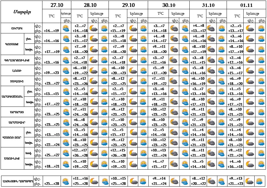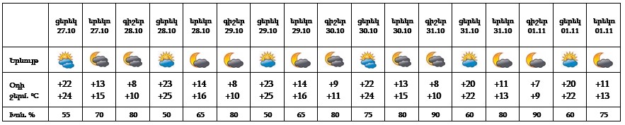 Երևան քաղաքում հոկտեմբերի 27-ի ցերեկը, 28-31-ին, նոյեմբերի 1-ին սպասվում է առանց տեղումների եղանակ։ Հոկտեմբերի 27-ին սպասվում է քամու ուժգնացում 12-15 մ/վրկ արագությամբ։