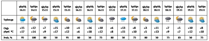 Նոյեմբերի 15-ին, 18-19-ին սպասվում է կարճատև անձրև։ Նոյեմբերի 17-ին սպասվում է անձրև։ Նոյեմբերի 16-ին սպասվում է առանց տեղումների եղանակ։