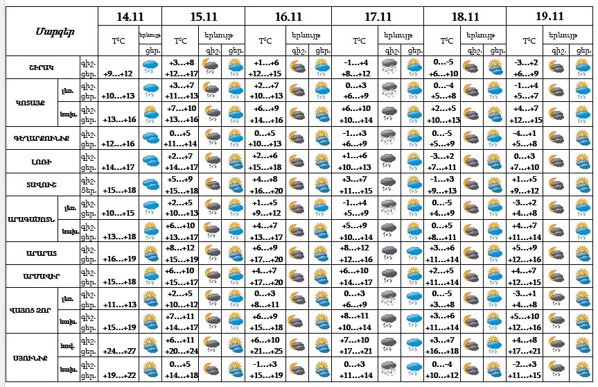 Օդի ջերմաստիճանը նոյեմբերի 14-ի ցերեկը կնվազի 3-4, 17-18-ին ևս 4-6 աստիճանով։