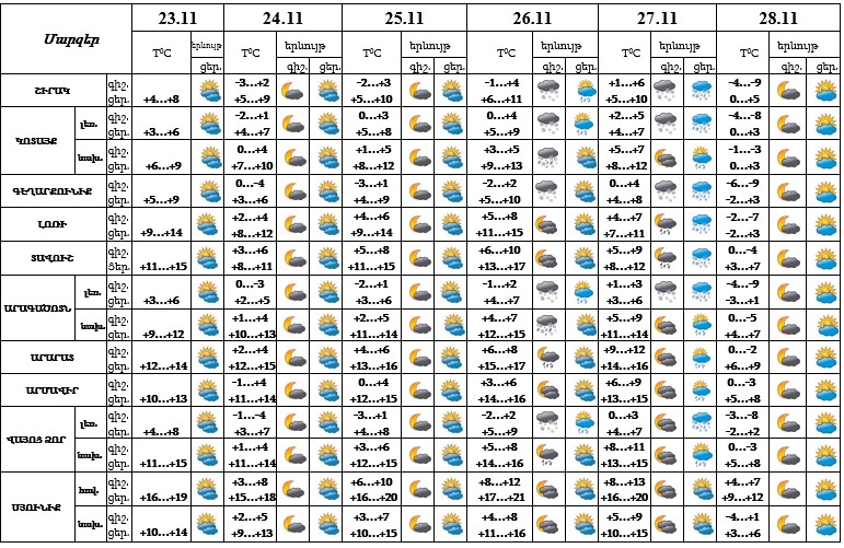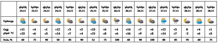 Օդի ջերմաստիճանը նոյեմբերի 23-25-ին աստիճանաբար կբարձրանա 2-4 աստիճանով, 28-ին կնվազի 7-10 աստիճանով։