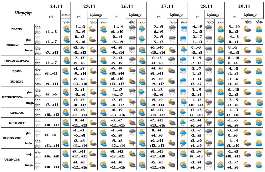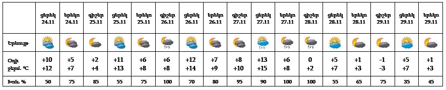Օդի ջերմաստիճանը նոյեմբերի 24-25-ին աստիճանաբար կբարձրանա 2-3 աստիճանով, 28-ին կնվազի 7-10 աստիճանով։