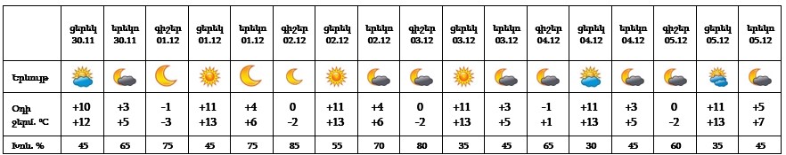 Հանրապետության տարածքում նոյեմբերի 30-ի ցերեկը, դեկտեմբերի 1-5-ին սպասվում է առանց տեղումների եղանակ։ Քամին՝ հարավարևմտյան, 2-5 մ/վ:
