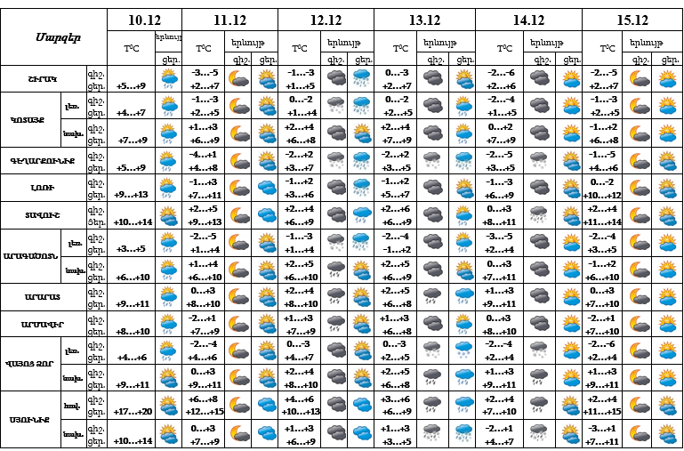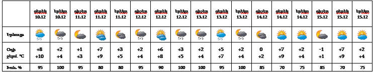 Հանրապետության տարածքում դեկտեմբերի 10-ի ցերեկը, 12-13-ին, 14-ի գիշերը առանձին շրջաններում սպասվում են տեղումներ և մառախուղ։ Դեկտեմբերի 11-ին, 14-ի ցերեկը, 15-ին սպասվում է առանց տեղումների եղանակ։