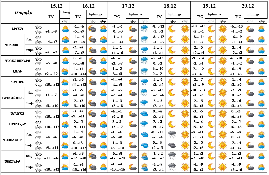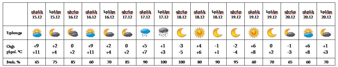 Երևան քաղաքում դեկտեմբերի 15-ի ցերեկը, 16-ին, 17-ի գիշերը, 18-20-ին սպասվում է առանց տեղումների եղանակ։