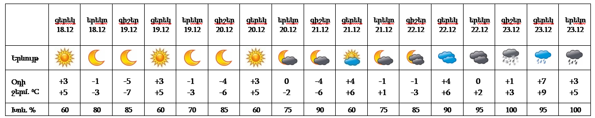 Հանրապետության տարածքում դեկտեմբերի 18-ի ցերեկը, 19-21-ին, 22-ի գիշերը սպասվում է առանց տեղումների եղանակ։