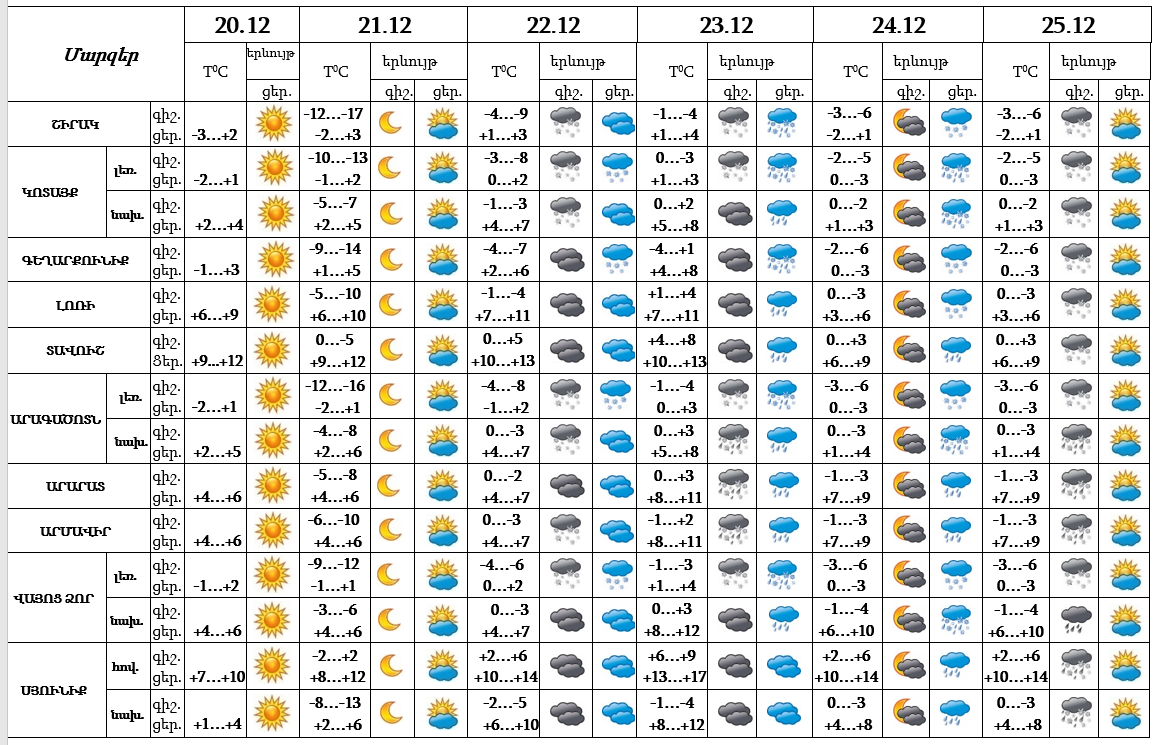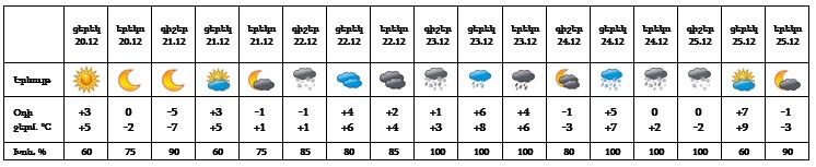 Հանրապետության տարածքում դեկտեմբերի 20-ի ցերեկը, 21-ին, 25-ի ցերեկը սպասվում է առանց տեղումների եղանակ։